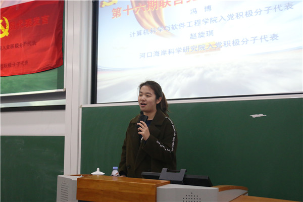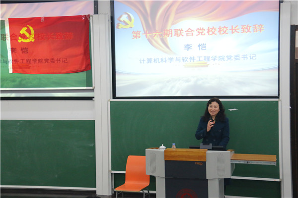 联合党校校长、学院党委书记李恺致开班辞 计软学院入党积极分子代表冯博、河口院入党积极分子代表赵旋琪分别代表学员发言。党校班主任刘国艳阐明了本期党校课程安排和结业考试等相关情况,强调了学习纪律和要求。