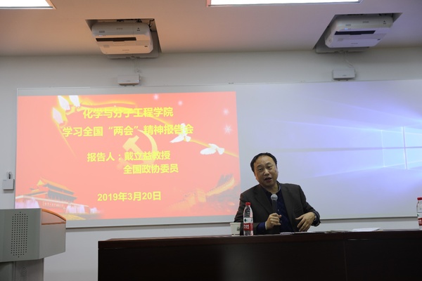 为深入学习贯彻全国“两会”精神,化学与分子工程学院党委于2019年3月20日上午在闵行校区化学楼135报告厅举行全国两会精神学习报告会。全国政协委员、副校长戴立益教授应邀作专题报告,学院党委书记鲜跃仲主持报告会,院长田阳及学院师生代表一百多人参加学习。