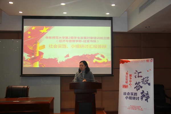 近期,经济与管理学部党委、经管书院党委2019年第2期学生发展对象培训班三班社会实践、主题研讨汇报答辩在闵行校区法商南楼516报告厅举行。经管书院党委副书记王郦玉、经济与管理学部关工委副主任徐丽华、经济与管理学部关工委委员周纪芗、校党委组织部张宗禧、经管书院工商管理类本科生党支部书记李旺、经管书院经济学类本科生党支部组织委员李雨晴共同担任评委。答辩由经管书院学生党建办公室副主任沈佳瑛主持。 在刚刚过去的寒假里,第2期学生发展对象培训班三班的42名学员开展社会实践,每名学员以实地走访结合线上了解的方式,自由选择故乡的基层党建服务中心进行调研,并按所选党建服务中心的地域划分为六个小组,每个小组以1~2类基层党建服务中心为研究对象,进一步深化前期调研感悟,深入探究基层党建。在此基础上,各小组开展了以“学思践悟、知行合一,做新时代合格党员”为主题的集体研讨,形成小组观点,以汇报答辩的形式分享、总结学习成果。