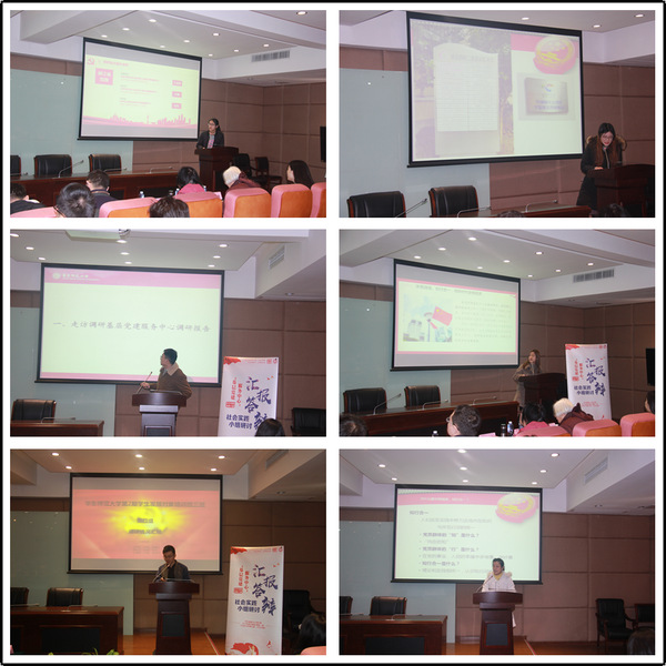 各组依次汇报答辩 会上,各小组的学员代表依次登台,就社会实践成果、主题研讨观点进行汇报,接受评委们的提问和点评。在社会实践汇报环节,各小组汇报答辩特点突出:调研对象广泛,到访地点包括上海、江苏、浙江、江西、河北、山西、新疆等多个祖国大陆省份;调研角度丰富,从基层党建服务中心的基本概况、功能分区、突出特色等实地情况出发,归纳总结党建服务中心目前存在的优点与不足,针对基层党建服务中心如何更好建设、学生党员怎样进行自我管理、我校如何建立党建服务中心等现实问题展开广泛研讨;调研结论深刻,针对加强基层党建服务中心建设这一核心问题,各组建言献策,包括最大化利用基础设施资源、推进“互联网+”党建工作新平台建设、积极开展与区域内基层党组织合作、大力畅通民意渠道、创新日常工作服务方法等对策建议,受到了评委们的高度肯定。