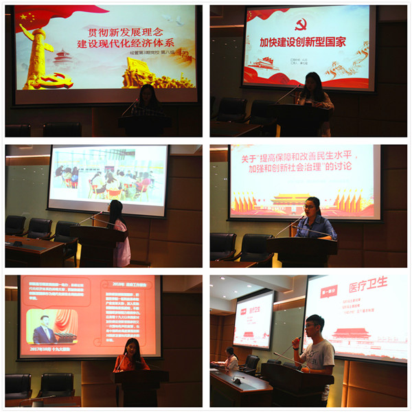 经管3期党校学员在中共一大会址纪念馆合影留念 交流汇报:研讨“两会”热点话题入脑入心 2018年4月25日下午,经管3期党校在闵行校区法商南楼516报告厅举行“学习十九大精神,关注‘两会’热点”小组汇报交流。活动采取小组先期自主讨论、现场同题汇报、评委提问答辩和组间互问答辩形式。学员代表分别围绕十九大报告和2018年“两会”热点中的6个主题——“贯彻新发展理念,建设现代化经济体系”、“坚定文化自信,推动社会主义文化繁荣兴盛”、“提高保障和改善民生水平,加强和创新社会治理”、“积极扩大消费和促进有效投资”、“扎实推进区域协调发展战略”、“加快建设创新型国家”进行汇报并讨论,同时接受评委和现场学员的提问。 经济与管理学部关工委委员孙厚琴在总结讲话中指出,交流中学员们表现出了较高的敏感度,希望未来同学们能够进一步结合专业知识,关心时事热点,做到理论联系实际,将所学理论和知识真正运用到实践探索中去。