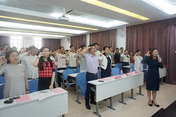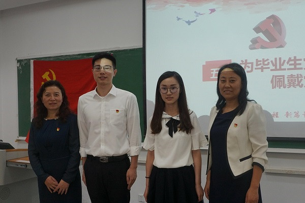 李恺书记带领党员宣誓 李恺和曹桂涛还为毕业生党员代表佩戴了党员徽章,希望党员们能够牢记党员身份,牢记党员使命。毕业生党员代表15级硕士毕业生党员王婧同学进行发言,对辛勤耕耘的老师们表达了深情的感恩,对母校表达了不舍的留恋与道别,也提出了对自身的严格要求,希望同学们在毕业之后能够依然坚守党员的使命,建设中华民族的宏伟蓝图。