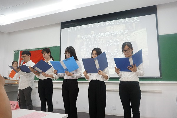 李彦垒老师为同学们上党课 本次活动还特别邀请了第十六期联合党校的积极分子们做大夏大学迁校纪念碑碑文的朗读。立迁校碑是大夏大学历史上的一件大事,它是师生不屈不挠、自强不息精神的象征。在战火硝烟中依旧坚持办学治学,用文化的理想来抵抗身处地狱中的苦难,用知识的进步来承担民族复兴的命运,已经成为华东师大无可估量的精神财富和弥足珍贵的文化资源。在离校教育活动中朗读碑文,希望毕业生党员们能够铭记历史,学习大夏大学“苦教、苦学、苦干”的三苦精神,激励党员们面对困境仍能坚定信念,奋斗不止。