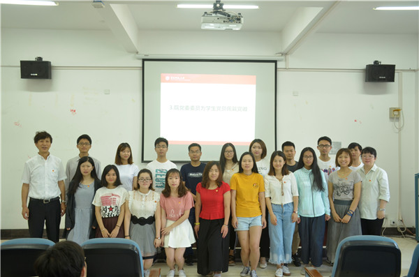 地理科学学院2018年优秀学生党员合影留恋 随后,进入“院党委委员为学生党员佩戴党员徽章”环节,段玉山老师和王婷婷老师为新发展的学生党员们佩戴党员徽章。