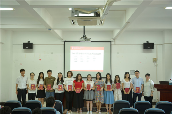 全体党员重温入党誓词 激昂的国歌拉开了大会的序幕,全体起立,奏唱国歌。接着,学院党委书记段玉山带领党员们重温入党誓词,再一次牢记使命,不忘初心。宣读誓词完毕,段玉山书记宣读2018年地理科学学院优秀党员名单并颁发证书,授予王文洁等15名学生党员“优秀党员”的荣誉称号,名单如下:王文洁、宋歌、易思、吴宾、尹梁明、朱露、梁鑫鑫、蒋俊帆、曾永胜、饶颖霞、沈琦、彭亚、李晓慧、邓依薇、周沙。他们中不乏在学生工作上尽心尽责、在学习科研中脚踏实地、全心全意为同学服务的支部书记、支部委员。段玉山老师和王婷婷老师为优秀党员们颁发了荣誉证书并合影留恋。
