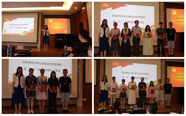 6月27日下午,为纪念建党九十七周年,总结学院党建工作,表彰做出杰出贡献的优秀党员和优秀党务工作者。心理与认知科学学院党委举办庆“七一”党员大会暨七一歌会。学院60余名教工党员和学生党员参加了本次大会。 学院党建工作回顾视频展播后,学院党委书记方媛致辞,她肯定了2017-2018年度学院党建工作取得的成绩,希望各基层党支部和全体共产党员继续发挥战斗堡垒和先锋模范作用,为推动学院的发展建设贡献力量。学院党委副书记兼副院长郝宁宣读了获校级七一表彰的师生党员名单:刘晓陵老师获华东师范大学“优秀共产党员”称号、杨林腾同学获华东师范大学“优秀学生党员”称号;同时,宣读了《关于表彰2018年度心理与认知科学学院优秀共产党员、优秀党务工作者的决定》。之后,方媛、郝宁为崔丽娟等7名优秀共产党员、孟慧等3名优秀党务工作者、李琳怡等10名优秀学生党员颁奖并表示祝贺。