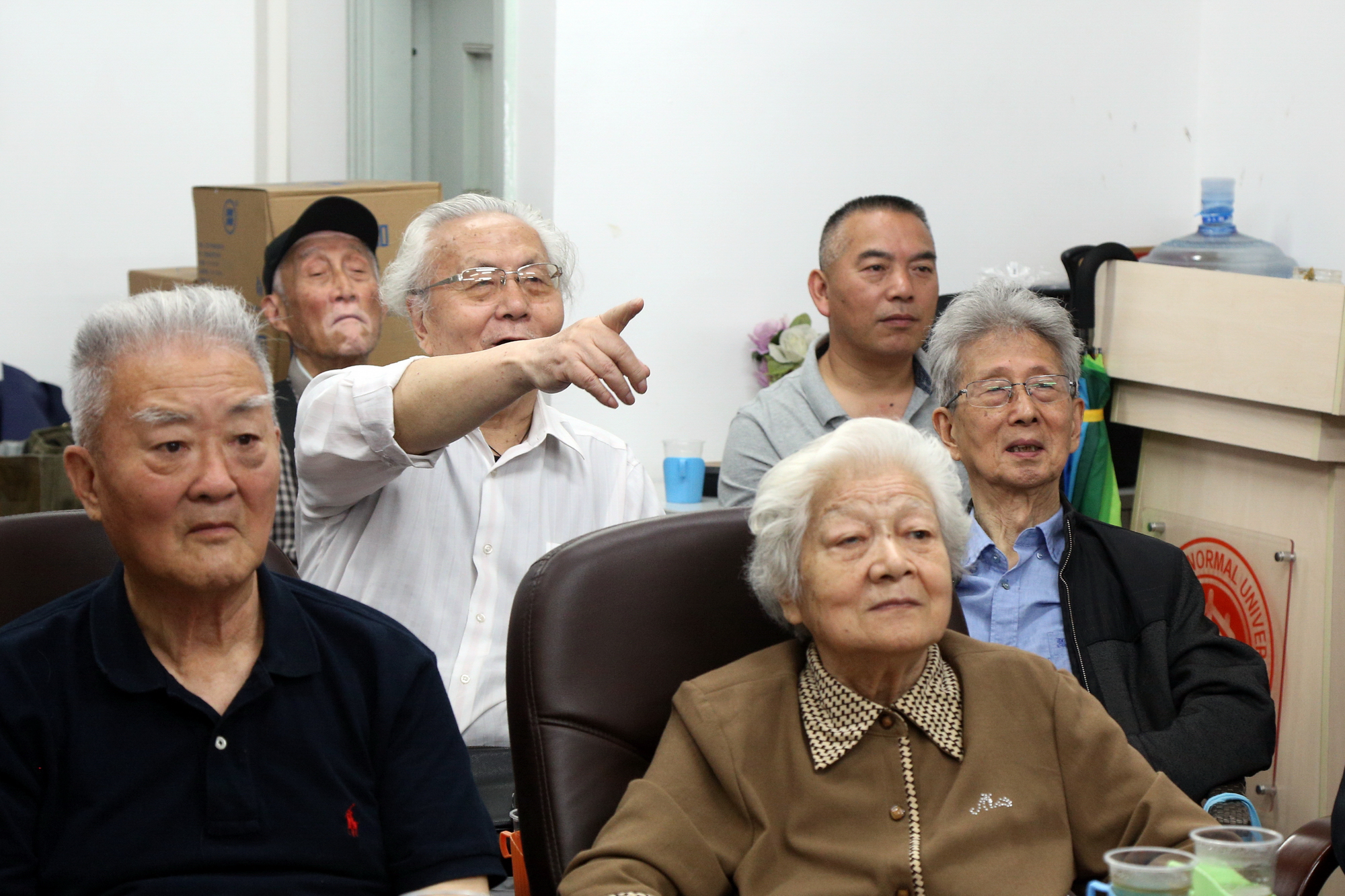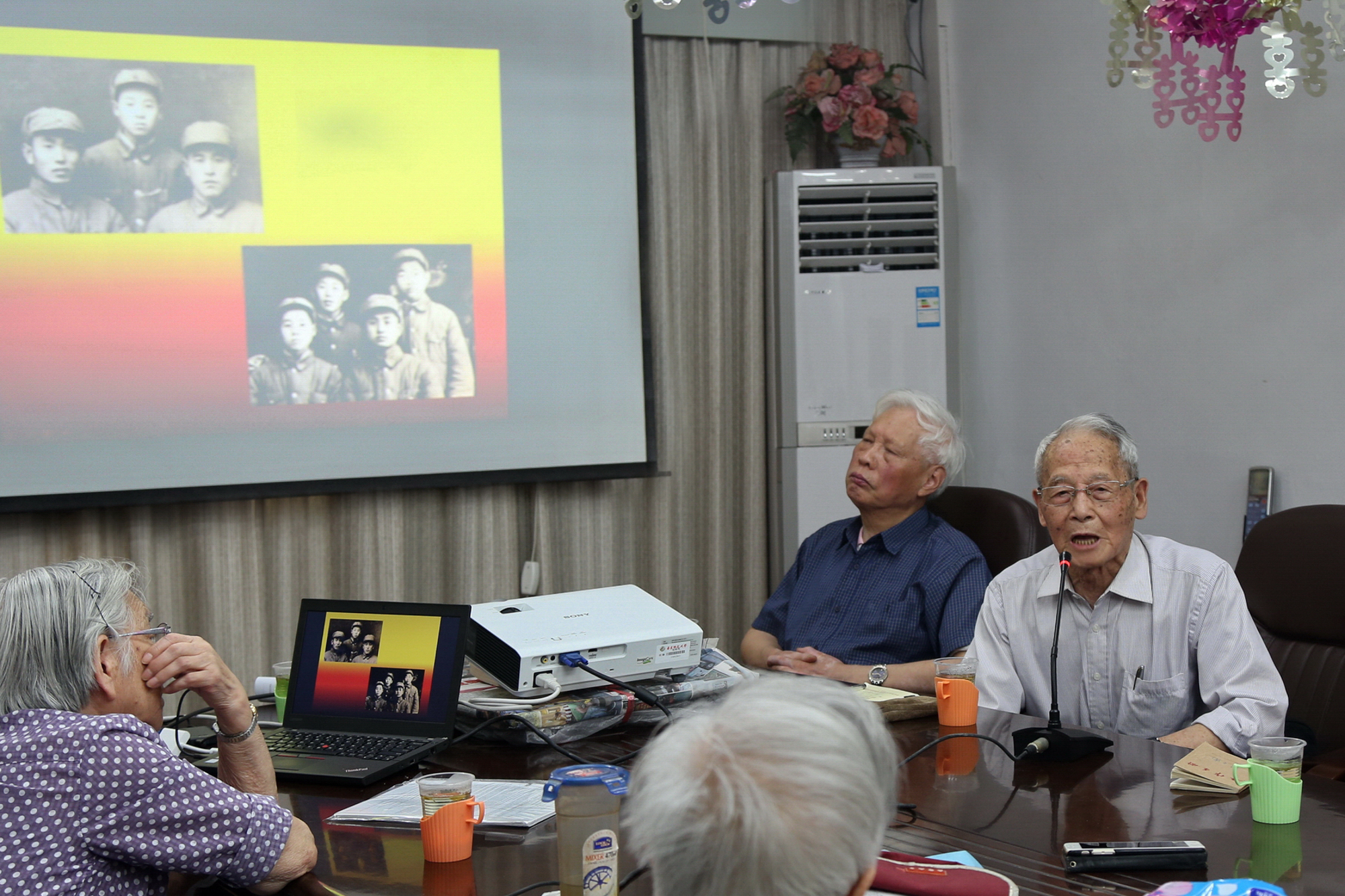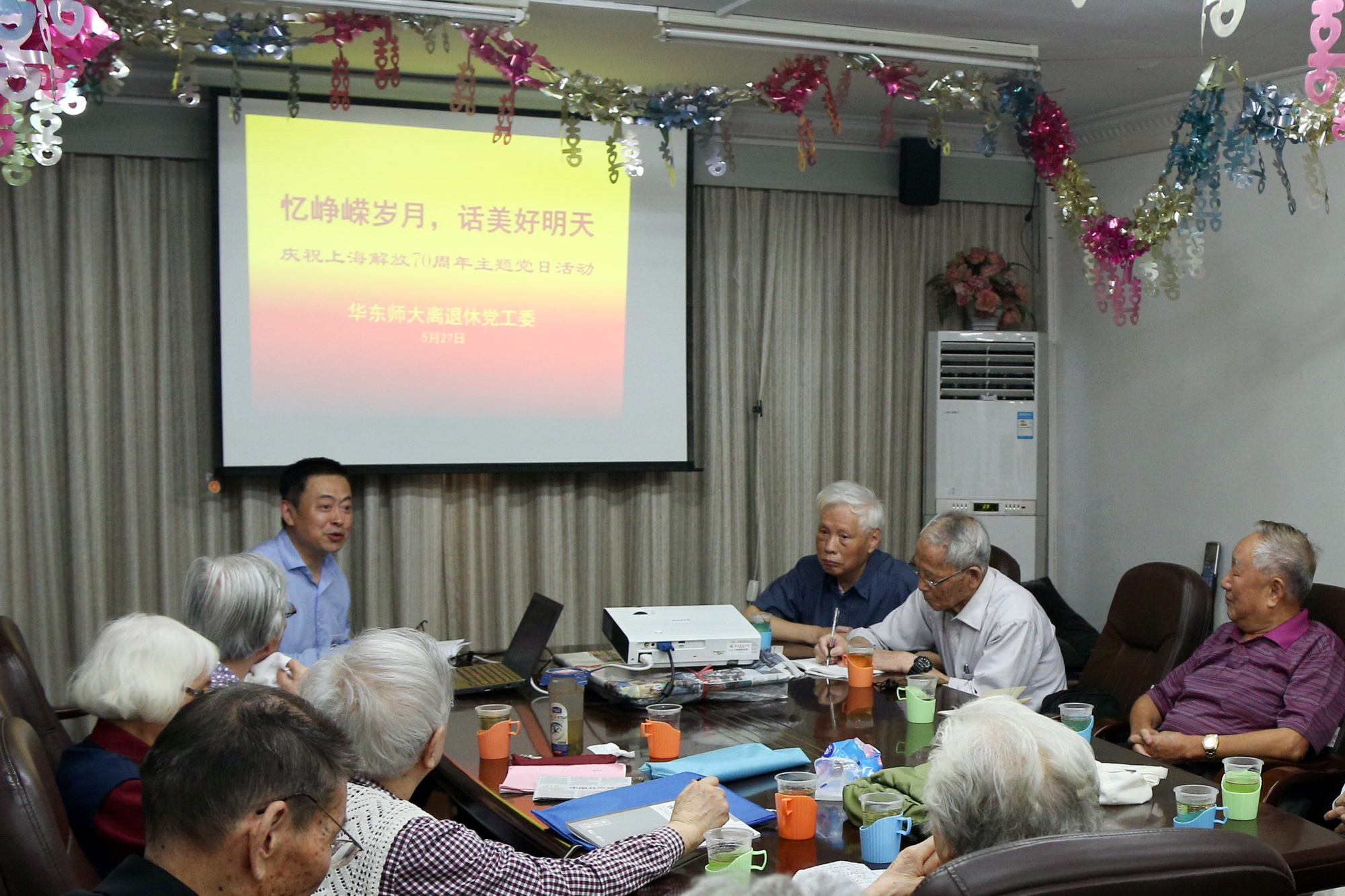 离退休党工委副书记时明惠介绍老同志老照片 一张张照片勾起了老同志在战争年代、白色恐怖中浴血奋斗的无限回忆,大家纷纷踊跃发言,讲述70年前自己如何踏上革命道路的点点滴滴,讲述每张照片背后的一段段往事。与会老同志中有很多是通过参加地下党领导的学生运动,加入地下党,最后成为坚定的革命者。70年前,国家积贫积弱,人民流离失所,老同志们在党的领导下,凭借坚定的信念和顽强的意志投身革命,为新中国的成立做出了自己的贡献。时至今日,再次回想起1949年5月27日上海解放的这一天,依然能清晰地记起当天的一切;讲到动情处,有的老同志泪雨哽咽,激动万分。老同志们在发言最后感恩党和国家对他们的培养,纷纷表达不忘初心跟党走的真情实意。 我校目前拥有70位抗战和解放时期参加革命的离休干部。今年是新中国和上海解放70周年,老龄办党支部的同志们结合党建工作创新创优项目的创建,学习身边老同志参加革命、为新中国成立和建设奋斗不息的先进事迹,从他们身上汲取精神力量,从思想上提高党性觉悟和修养,用心用情做好老龄工作。大家表示老同志是上海解放的参与者和见证者,没有革命前辈前赴后继的奋斗和牺牲,就没有共和国辉煌灿烂的今天。通过这次主题党日活动,不仅了解了老一辈对对党的情怀和忠诚,更真切感受到老一辈“为有牺牲多壮志,敢叫日月换新天”的革命乐观主义精神,进一步增强了青年一代建设新时代中国特色社会主义的责任感和使命感。 安振兴同志以诗歌《惊天动地的小事》讴歌入城解放军秋毫无犯不扰民的故事,以《白发愈深情愈浓》表达爱党爱国之情。