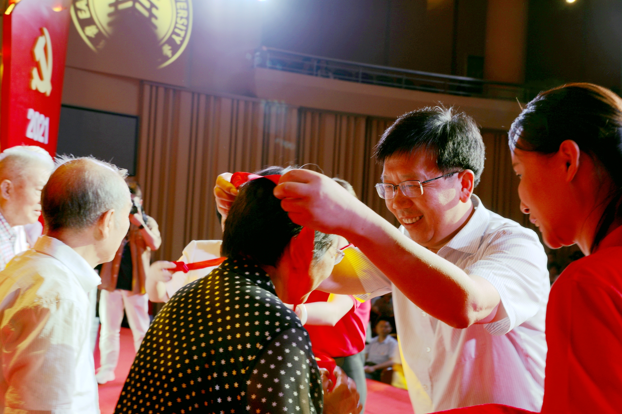 校党委书记梅兵,校长、校党委副书记钱旭红为5位党龄达到50周年的老同志代表颁发“光荣在党50年”纪念章 今年,党中央决定首次颁发“光荣在党50年”纪念章。大会邀请了5位党龄达到50周年的老同志代表——离休干部第一党支部书记赵继铨同志,离休干部第三党支部书记包汉中同志,退休干部、原校党委副书记吴铎同志,物理与电子科学学院退休教师马龙生同志,退休干部、校关工委委员、特邀党建组织员孙桂华同志。校党委书记梅兵,校长、校党委副书记钱旭红为他们颁发了“光荣在党50年”纪念章,学生党员为老同志献上了鲜花,全场响起了雷鸣般的掌声,经久不息。