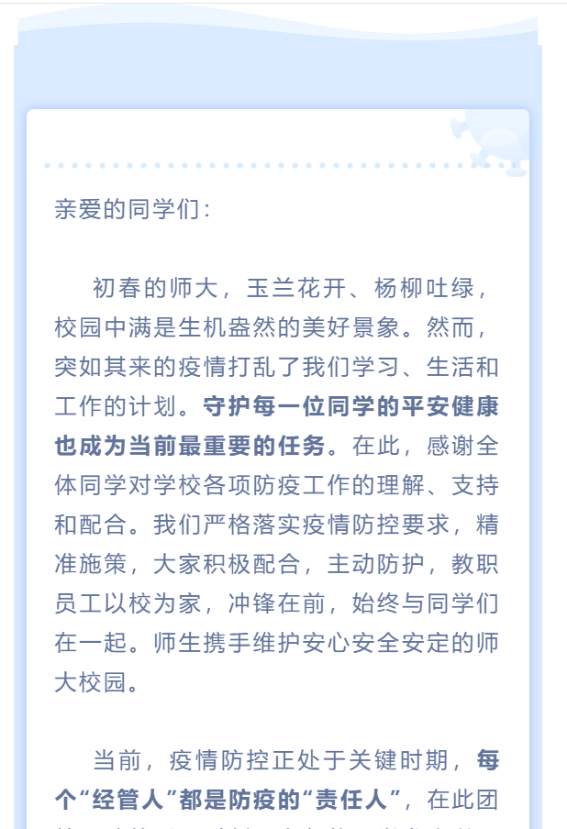 学生家长捐赠物资 学部校友会也发出倡议,号召广大校友在力所能及的情况下共同驰援守护母校。目前,学部校友及社会人士的爱心还在源源不断汇聚学校,99级工商管理系施屹校友、90级经济学硕士严正校友、96级房地产专业穆晓峰校友,学部校友会秘书长白露等慷慨捐资......大家用爱心传递力量,用实际行动彰显爱在师大,广大校友及师大之友的襄助和支持也成为师生度过抗疫关键时期的重要保障和坚不可摧的精神力量。 加强疫情防控,共筑疫情防线,我们众志成城,守护校园安康。坚信疫情终会过去,静待师大春暖花开。
