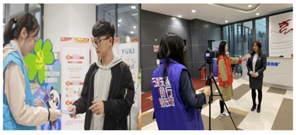 传播学院党委副书记杜彬彬老师发言 第三站:宝龙广场进博会公益宣传 主会场活动结束后,师生党员共同前往宝龙广场开展进博会宣传志愿者活动。党员志愿者分成两支志愿服务队,一支服务队在宝龙广场党员服务站和广场大厅内为行人发放进博会知识宣传页,在讲解中让更多人们了解进博会的信息;另一只服务队对行人进行快问快答的采访拍摄,在趣味采访过程中推广进博知识,在宣传活动中进一步实践党员服务精神。