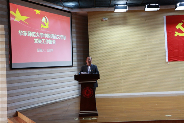 大会现场 王志同志宣布华东师范大学中国语言文学系党员大会开始,全体党员起立奏唱国歌,王庆华同志代表中文系党委作《华东师范大学中国语言文学系党委工作报告》,报告包括两个部分:一是中文系党委过去五年的工作总结,王庆华同志向全体党员汇报了过去五年中文系在人才队伍建设、基层组织建设等方面取得的不凡成绩;二是中文系党委今后五年的工作展望。王庆华同志强调未来五年中文系将加强党支部建设、党风廉政建设等方面的工作,顶层规划了中国语言文学学科“三步走”战略,全力提升中国语言文学系的综合实力和国际影响力。