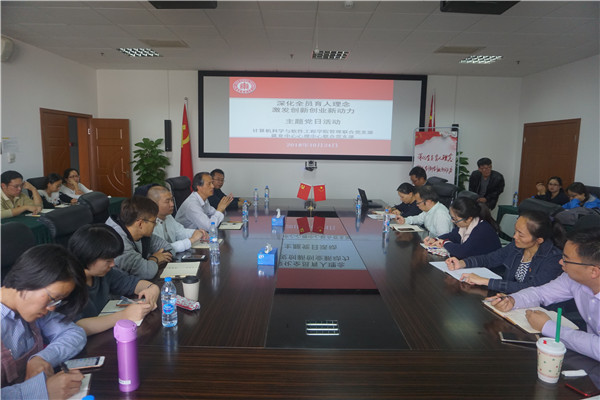 联合主题党日活动现场 首先,计算机科学与软件工程学院管理联合党支部书记谢书玲致欢迎词,双方介绍本支部党员。 随后,就业创业指导与服务中心主任阮平章以“创新创业大赛与创业实践”为主题阐述相关工作情况,并对学院为学校夺得互联网+大赛首金表示祝贺。阮平章从创新创业大赛的介绍、创业基地的建设、大学生双创的意义与价值、创业实践等几个方面,介绍双创相关的工作与实践;并对学院双创工作提出三点建议:互联网+新时代,发挥专业背景;加强学院交流,师生融合师生共创;挖掘有竞争力的项目,精准指导增强信心。